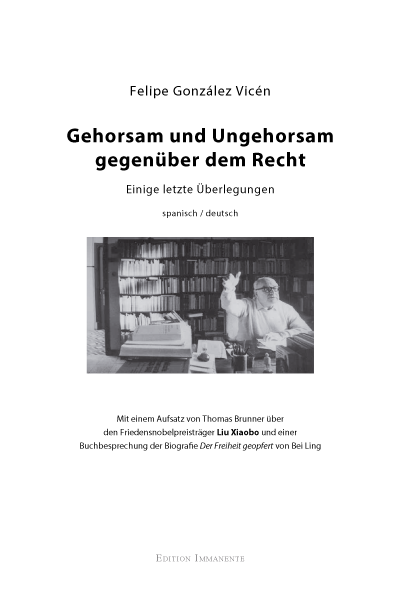 Die hiermit vorgelegte kleine Veröffentlichung möge dazu beitragen, dass die bedeutenden Anregungen des renomierten spanischen Rechtsphilosophen Felipe González Vicén auch in Deutschland wieder wahrgenommen werden können. Und dass dieser Text in Zusammenhang mit einer Würdigung des chinesischen Friedensnobelpreisträgers Liu Xiaobo erscheint, kann vielleicht die Aktualität des Werkes F. González Vicéns erlebbar werden lassen, denn beiden ist ein verwandter ethischer Individualismus eigen: